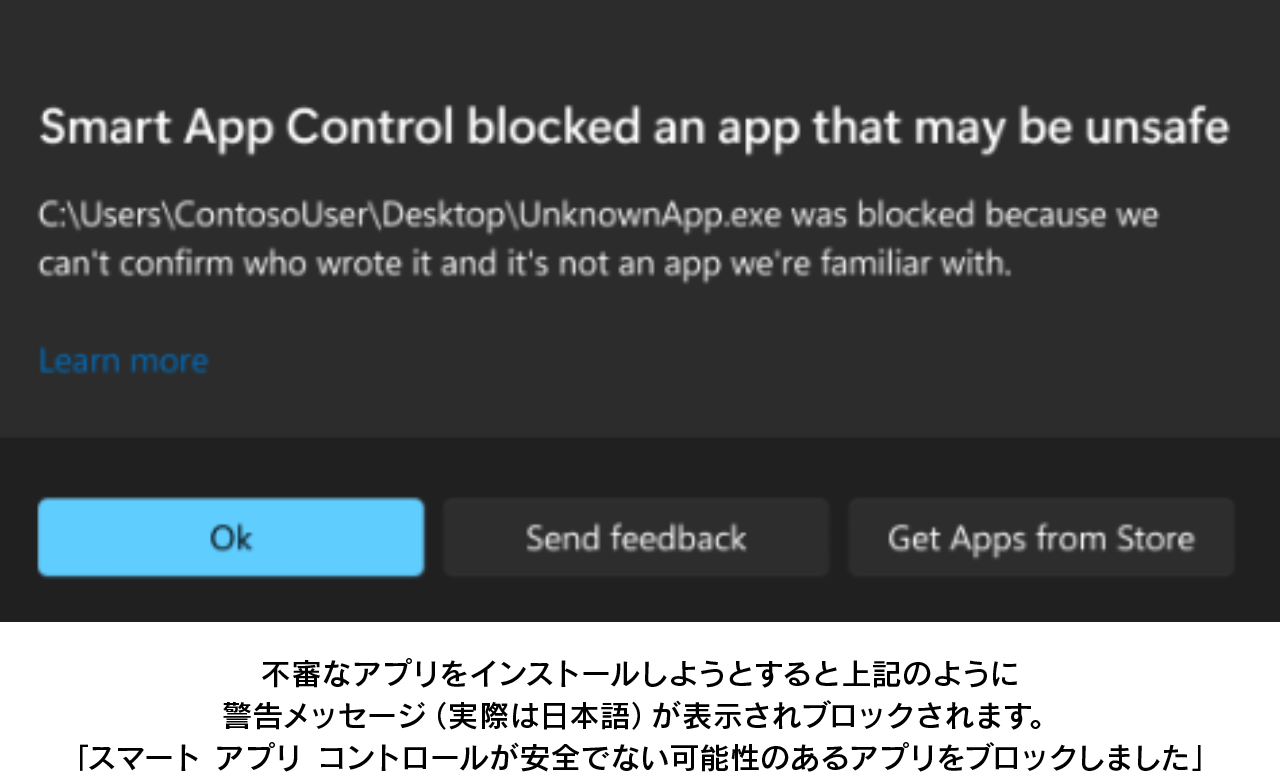 「スマート アプリ コントロール」は、信頼されていないアプリケーションやファイルをインストールできないようにする機能です。この機能は、『Windows Defender Application Control』(WDAC)のインテリジェンス/AIをベースにしたクラウド上のサービスで、アプリケーションのインストールの可否が判断されるようです。Windows 11 22H2以降は標準搭載されています。