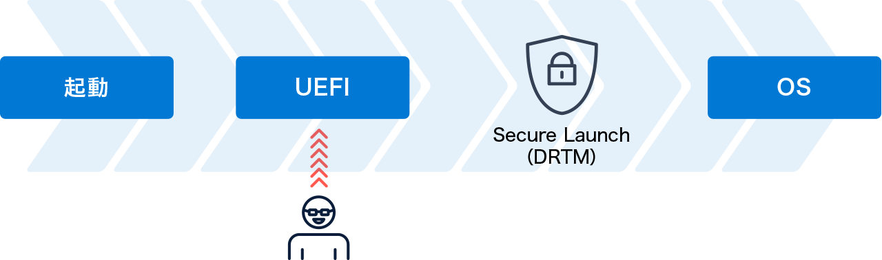 DRTMはSecured-Core PCを構成する技術の1つです。最新のIntel vProプロセッサーに搭載された「Intel Hardware Shield」(※2)に実装されているDRTM機能を利用することで、UEFI(Unified Extensible Firmware Interface)への侵害を監視することが可能です。UEFIとは、コンピュータ内の各装備を制御するファームウェアとOSの間の通信仕様を定めた基準規格の一つで、従来のBIOSに代わるものです。