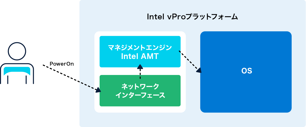 そこで、インテル社のvProプラットフォームに搭載されているIntel AMT(※2)を活用します。Intel AMTはPCの電源やOS稼働状況にかかわらず、管理用のハードウェアとLANのインターフェースが動作していれば、遠隔地からPCの電源ONやリセットが可能となります。長期間シャットダウンしているPCに対しても、遠隔でパッチ適用を行うことが可能になります。Intel AMTをご利用になるには、インテルvProプラットフォーム搭載モデルの導入をご検討ください。