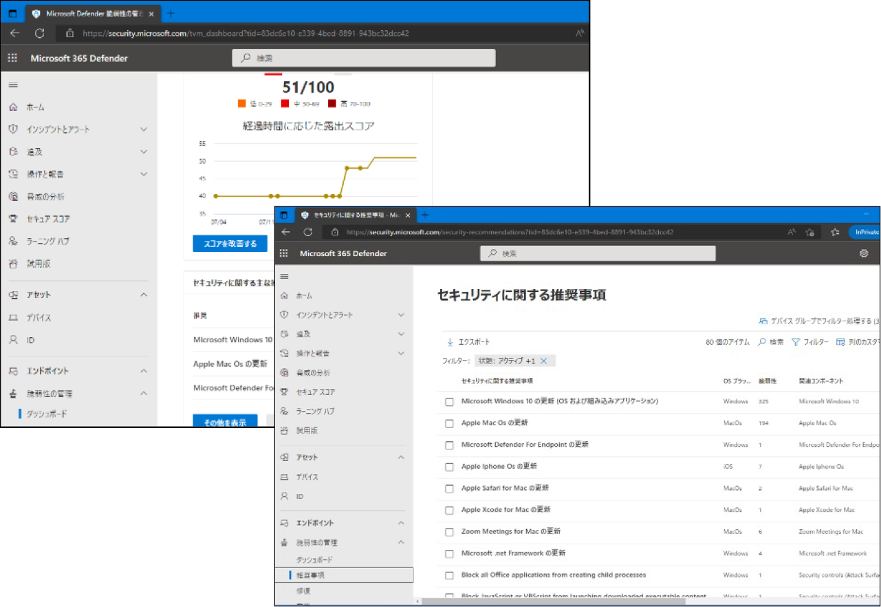 Microsoft Defender for Endpoint の機能には脆弱性管理が備わっています。Microsoft Defender for Endpoint をオンボードしていれば、そのオンボードされたデバイスの脆弱性を一元管理することが可能です。組織の脆弱性による統合的スコアが可視化され、IT管理者は組織の脆弱性管理状況が簡単に把握できるようになります。(Microsoft 365 E3/E5 等のライセンスが必要です。)