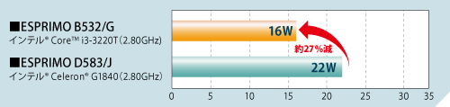 低消費電力CPU「インテル® Celeron® G1610T」、「インテル® Core ™ i3-3220T」、「インテル® Core ™ i5-3470T」、「インテル® Core ™ i7-3770T」の採用により大幅な消費電力の削減を実現しています。