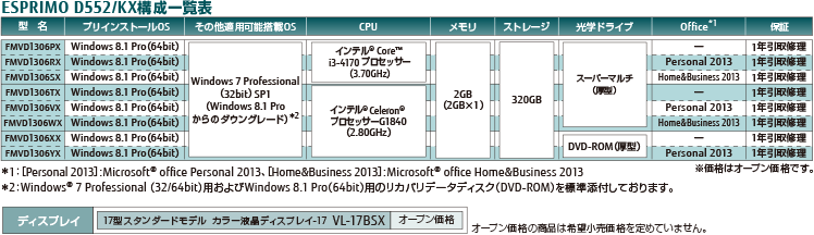 | [プリインストールOS] Windows 8.1 Pro (64bit) [その他適用可能搭載OS] Windows 7 Professional (32bit)SP1 (Windows 8.1 Proからのダウングレード) |