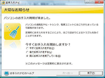 パソコンの定期的なお手入れを促したり、CPU発熱と冷却用ファンの状態を検知するアプリケーションをプリインストールしています。異常時には、画面右下にあるタスクトレイアイコンが点滅して、お手入れを促します。