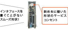 サービスコンセントを1個から2個へ増やすことができます。これによりディスプレイを2台接続することができ、奥行きも電源ケーブルを1本接続している時と変わりません。さらに、サービスコンセントの形状を斜め右に傾けることで接続した電源ケーブルがその他のインタフェースを塞ぐことなくスムーズにケーブル類が接続できるよう設計されています。また、電源連動式サービスコンセントにより、マルチディスプレイ環境でも省エネルギーを実現できます。