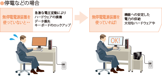 無停電電源装置を使用することで、落雷などによる急激な電圧変動や、外部から受ける電磁ノイズや静電気がある場合でもパソコンに安定的な電力を供給します。そのため電源障害によるハードウェアの損傷を防ぎます。停電などにより電力供給が遮断された場合でも自動的にバッテリー運転に切り替わり、システムの稼動を継続できます。