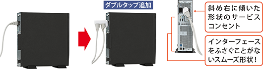 サービスコンセントを1個から2個へ増やすことができます。これによりディスプレイを2台接続することができ、奥行きも電源ケーブルを1本接続している時と変わりません。さらに、サービスコンセントの形状を斜め右に傾けることで接続した電源ケーブルがその他のインタフェースを塞ぐことなくスムーズにケーブル類が接続できるよう設計されています。また、電源連動式サービスコンセントにより、マルチディスプレイ環境でも省エネルギーを実現できます。