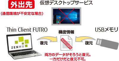 外出先で資料を見たい。プレゼンテーションをしたい。しかし、通信環境が悪く仮想デスクトップサービスを安定してご利用いただけない場合、秘密分散ソフト「ZENMU for PC & USBメモリ追加」(注2)を使い予めZENMUドライブにデータを分割保存すれば閲覧することが可能です。