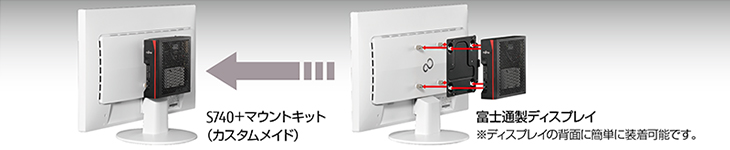 ディスプレイマウントキットや、ディスプレイアームにPC本体を装着することによりPCの設置面積が実質ゼロとなり、机上のスペースをより有効利用いただけます。