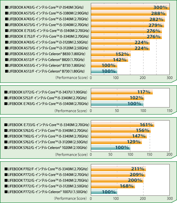 このベンチマークはCPUの性能を判断するための、当社におけるある一定のシステム構成での検証値であり、インテル®製品の性能の概算の値を表しているものです。測定は各機種の標準構成(注)で行っています。システムの構成や条件の違いにより、実際の性能は当カタログの性能テストや評価とは異なる場合があります。