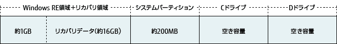 (注)STYLISTIC Q552/Eにつきましては、WindowsRE領域+システム領域:約1.2GB使用。選択したHDD容量より約1.2GBを除いた容量の約50%ずつが、パーティション3(Cドライブ)/パーティション4(Dドライブ)となります。各パーティションはいずれも、NTFSとなります。