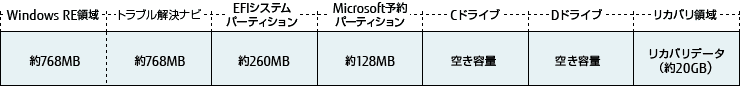 Windows RE領域+トラブル解決ナビ:約1.5GB、EFIシステムパーティション:約260MB、Microsoft予約パーティション:約128MB、リカバリ領域:約20GB使用。選択したHDD容量より約21.9GBを除いた容量の約50%ずつが、パーティション5(Cドライブ)/パーティション6(Dドライブ)となります。なお、各パーティションのファイルシステムはいずれも、NTFSとなります。(トラブル解決ナビの区画のみは、FAT32になります)