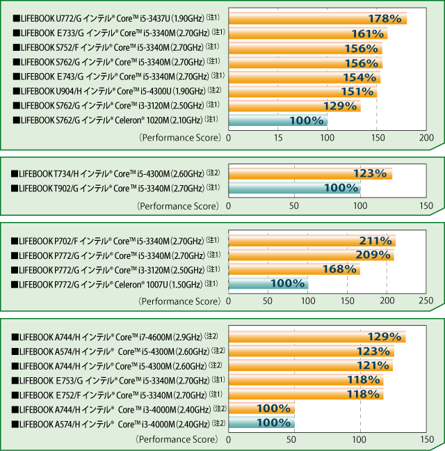 このベンチマークはCPUの性能を判断するための、当社におけるある一定のシステム構成での検証値であり、インテル®製品の性能の概算の値を表しているものです。測定は各機種の標準構成で行っています。システムの構成や条件の違いにより、実際の性能は当カタログの性能テストや評価とは異なる場合があります。