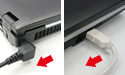コネクター部の耐久性を確認するため、ACアダプター、USB、PCカードなどの各種インターフェースに対し、コネクター挿抜の繰り返しや、大きな力で引っ張るといった試験を行い、強度のチェックを行います。