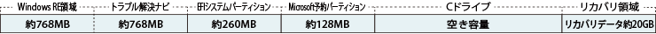 Windows RE領域+トラブル解決ナビ:約1.5GB、EFIシステムパーティション:約260MB、Microsoft予約パーティション:約128MB、リカバリ領域:約20GB使用。選択したHDD容量より約21.9GBを除いた容量の約50%ずつが、パーティション5(Cドライブ)/パーティション6(Dドライブ)となります。なお、各パーティションのファイルシステムはいずれも、NTFSとなります。(トラブル解決ナビの区画のみは、FAT32になります)