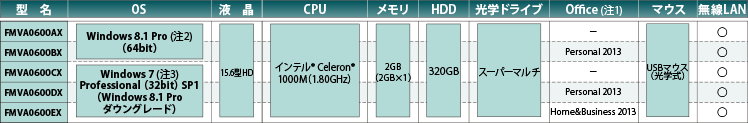 | [プリインストールOS] Windows 8.1 Pro (64bit)(注1) [その他適用可能搭載OS] Windows 7 Professional (32bit)SP1 (Windows 8.1 Pro からのダウングレード)(注2) |