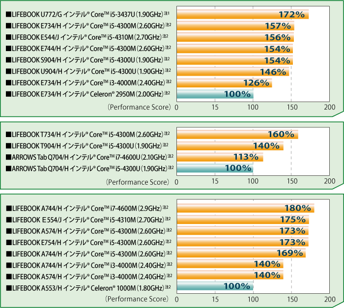 このベンチマークはCPUの性能を判断するための、当社におけるある一定のシステム構成での検証値であり、インテル®製品の性能の概算の値を表しているものです。測定は各機種の標準構成で行っています。システムの構成や条件の違いにより、実際の性能は当カタログの性能テストや評価とは異なる場合があります。