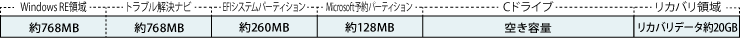 Windows RE領域+トラブル解決ナビ:約2.0GB、EFIシステムパーティション:約260MB、Microsoft予約パーティション:約128MB、リカバリ領域:約20GB使用。選択したHDD容量より約22.5GBを除いた容量がパーティション5(Cドライブ)となります。なお、各パーティションのファイルシステムはいずれも、NTFSとなります。(トラブル解決ナビの区画のみは、FAT32になります)