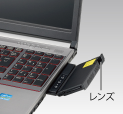 パソコンのモバイルマルチベイ部分に差し込むモバイル型プロジェクターユニット。パソコンに装着して使用すれば、いつでもプロジェクターユニットとして使用可能です。ワンタッチで取り外しが可能なため、DVD-ROMドライブなど他のユニットへの変更も容易です。