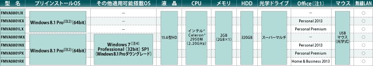 | [プリインストールOS] Windows 8.1 Pro (64bit)(注1) [その他適用可能搭載OS] Windows 7 Professional (32bit)SP1 (Windows 8.1 Pro からのダウングレード)(注2) |