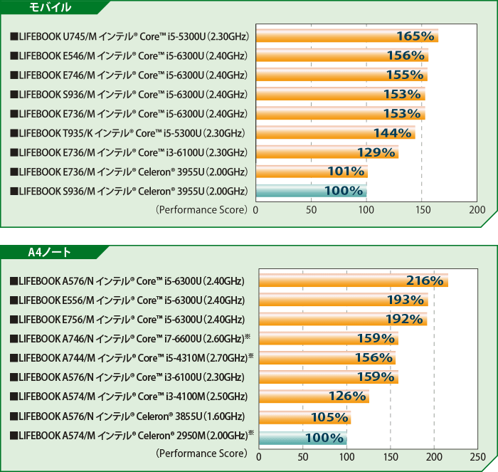 このベンチマークはCPUの性能を判断するための、当社におけるある一定のシステム構成での検証値であり、インテル®製品の性能の概算の値を表しているものです。測定は各機種の標準構成で行っています。システムの構成や条件の違いにより、実際の性能は当カタログの性能テストや評価とは異なる場合があります。