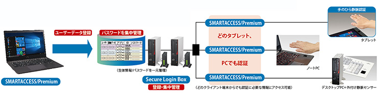 「SMARTACCESS / Premium」と「Secure Login Box」を用いれば、生体情報やパスワードを一元管理できます。