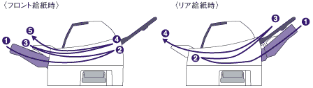 (*)単票複写紙を使用する場合には、手差し・フロントカットシートフィーダでは後方に、リアカットシートフィーダでは手前に用紙を排出してください。