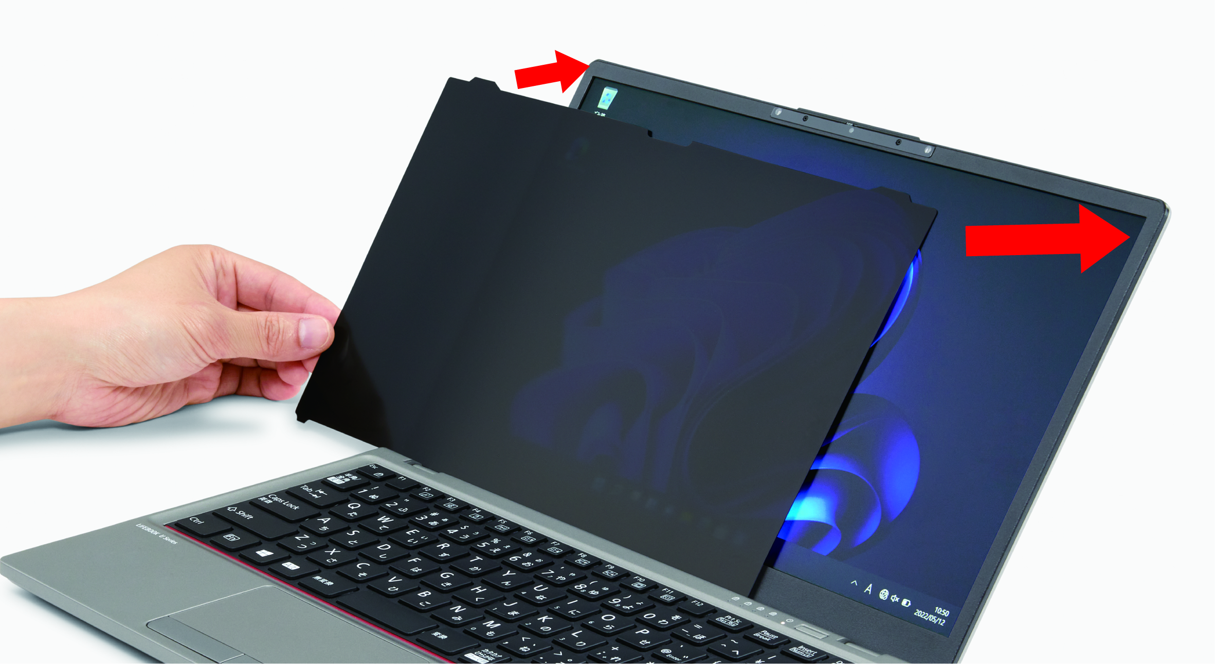 簡単に着脱可能なのぞき見防止専用プライバシーフィルター(カスタムメイドで提供:タッチパネルモデルは除く)を使うことで、のぞき見による情報漏えいリスクを低減。