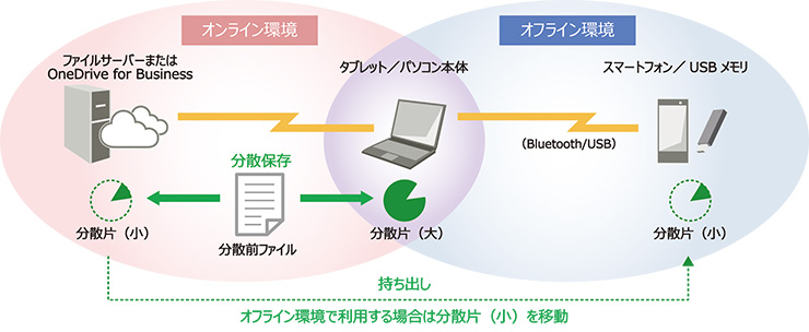 オンライン環境では、分散片をPC本体とファイルサーバーに保存。
