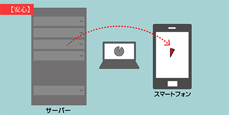 ネットワークに接続できない場所でPCを利用する際は、ファイルサーバーに保存した分散片をスマートフォンに移動させるため、オフライン環境でも安心・安全な運用が可能。PC本体とスマートフォンの分散片を結合してファイルを開くことができます。